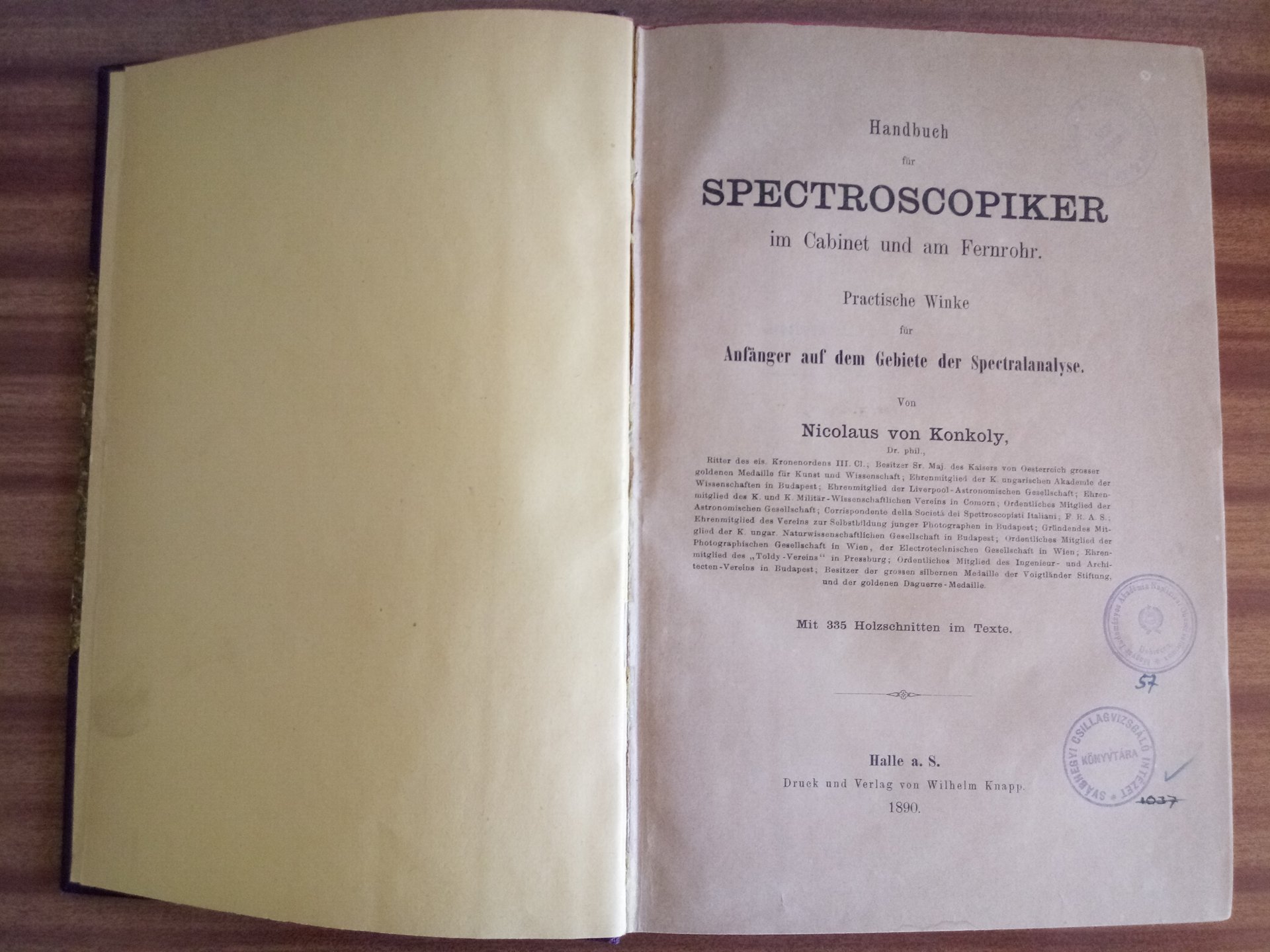Príručka pre spektroskopiu napísaná Mikulášom Thegem Konkolym, vydaná v Halle v roku 1890. Kniha pochádza z autorovej pozostalosti.