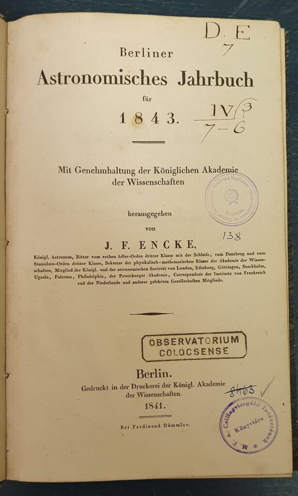 Astronomické ročenky obsahujúce predpovede polôh nebeských telies pre roky 1843 a 1849 z knižnice Staroďalského observatória. Ročenky boli vydané v roku 1841 a 1846 a patria medzi najstaršie v zbierkovom fonde múzea. Ich vydanie podporil známy nemecký astronóm a riaditeľ berlínskeho observatória Johann Franz Encke (1791-1865). Knihy pochádzajú z pozostalosti zakladateľa hvezdárne – Mikuláša Thegeho Konkolyho.