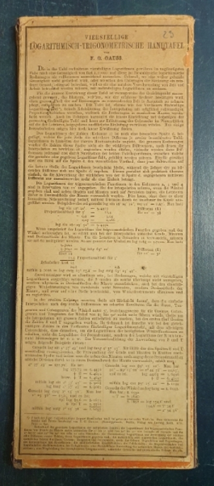 Štvorciferná logaritmická tabuľka od nemeckého geodeta Friedricha Gustava Gaussa (1829-1915) vydaná Ludwigom Rauhom v roku 1870. Tabuľka slúžila k matematickým a goniometrickým výpočtom používaných pri astronómii. Predmet pochádza z pozostalosti zakladateľa hvezdárne Mikuláša Thegeho Konkolyho.