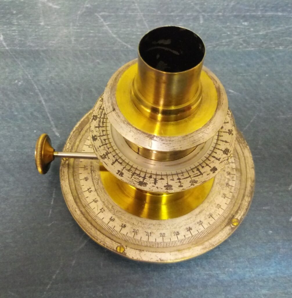 Okulár so stupnicou na meranie pozičného uhla medzi pozorovanými astronomickými objektmi. Meranie pozičného uhla sa vykonávalo pomocou stupníc na bokoch a zaistením skrutkou. Predmet pochádza z pozostalosti zakladateľa hvezdárne Mikuláša Thegeho Konkolyho.
