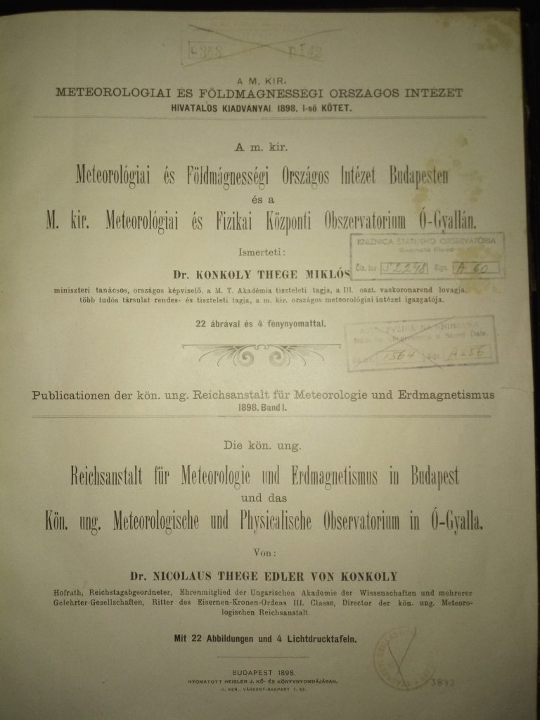 Organizačný poriadok astrofyzikálneho, meteorologického a geomagnetického observatória v Starej Ďale. Kniha bola vydaná v roku 1898 v Budapešti a jej autorom je Mikuláš Thege Konkoly.