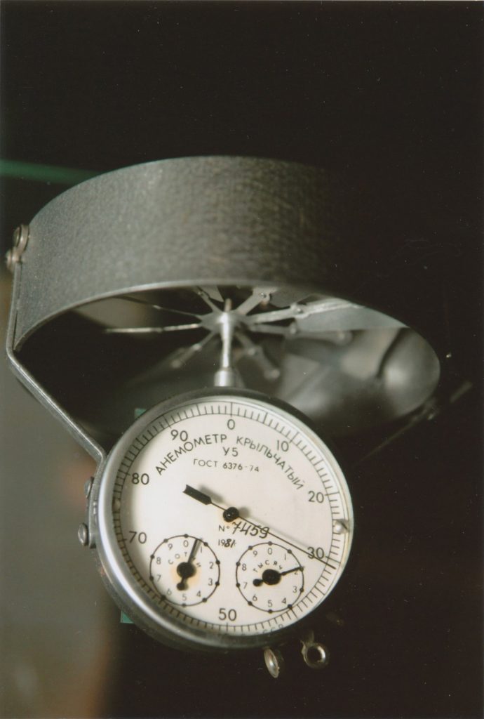 Ručný prístroj na meranie rýchlosti vetra. Tento prístroj nemeral okamžitú rýchlosť vetra, ale počas určeného času merania sa odčítala dráha vetra v metroch, z čoho sa vypočítala priemerná rýchlosť vetra. Anemometer je používaný v námorníctve, v meteorológii a v letectve. Prístroj bol vyrobený v Sovietskom zväze v továrni Kriličatij pod číslom 7459.