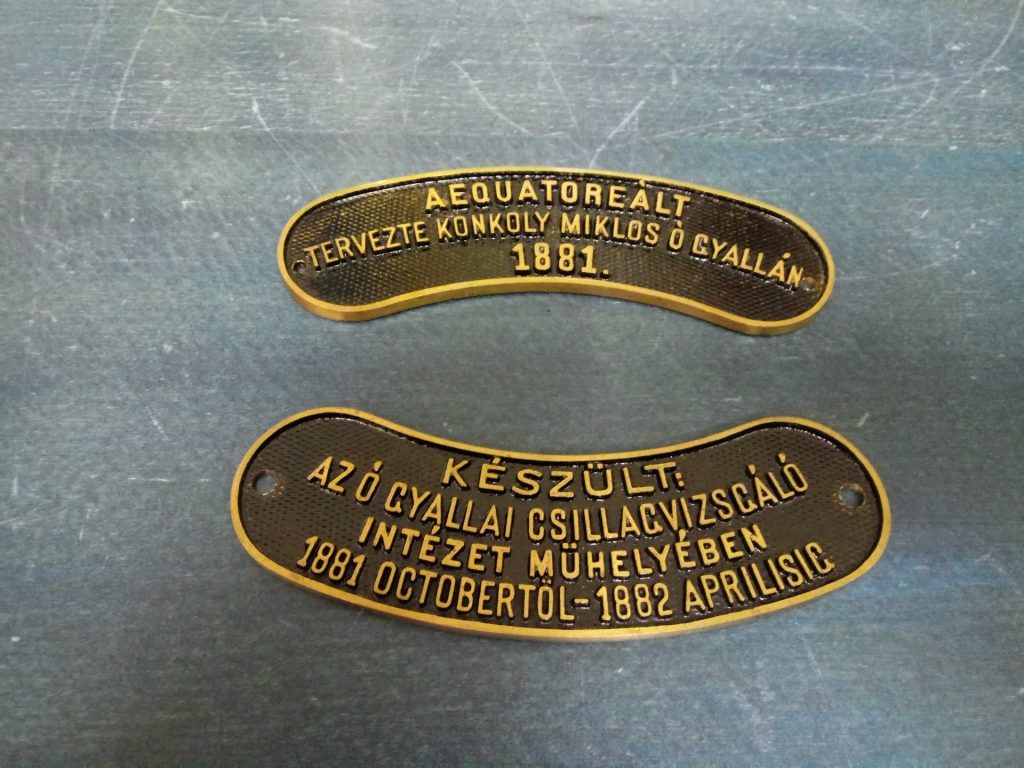 Nápis na druhej tabuľke je nasledovný: KÉSZÜLT: AZ Ó GYALLAI CSILLAGVIZSGÁLÓ INTÉZET MŰHELYÉBEN 1881 OCTOBERTOL – 1882 APRILISIC, čo znamená: Vyrobené v Staroďalskej hvezdárni od októbra 1881 do apríla 1882. Predmety pochádzajú z pozostalosti zakladateľa hvezdárne Mikuláša Thegeho Konkolyho.